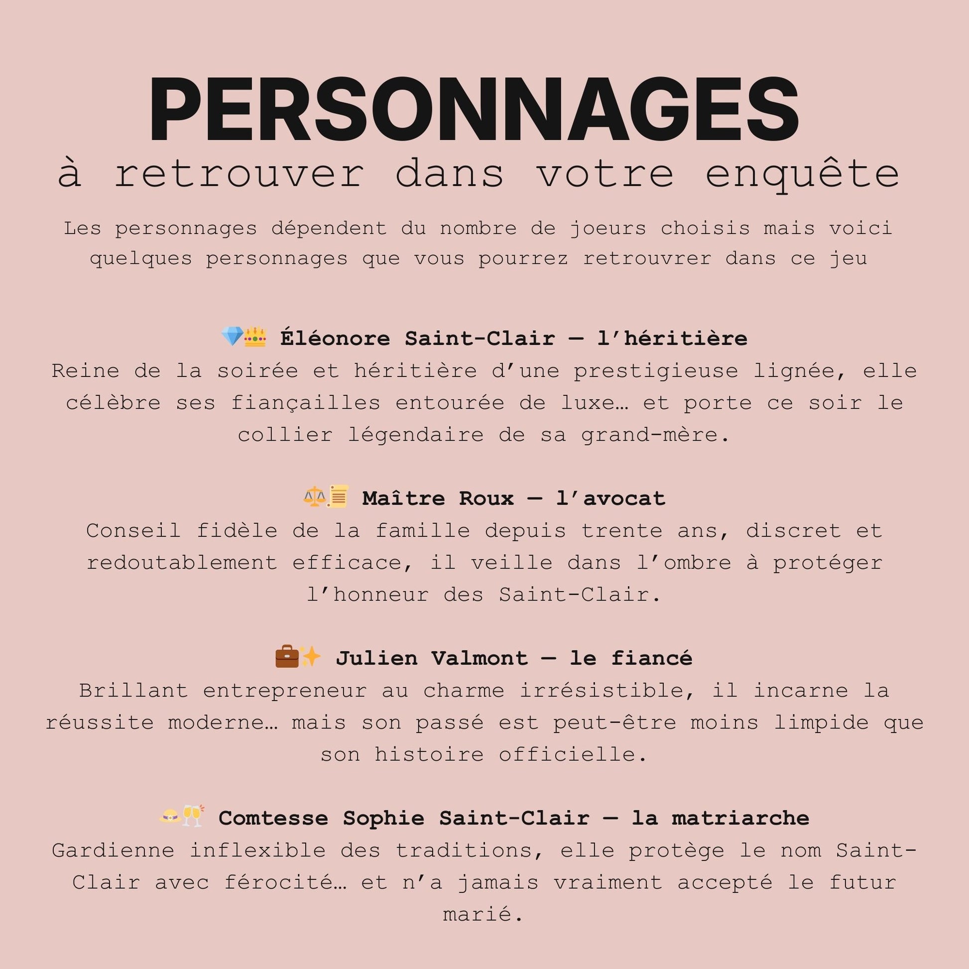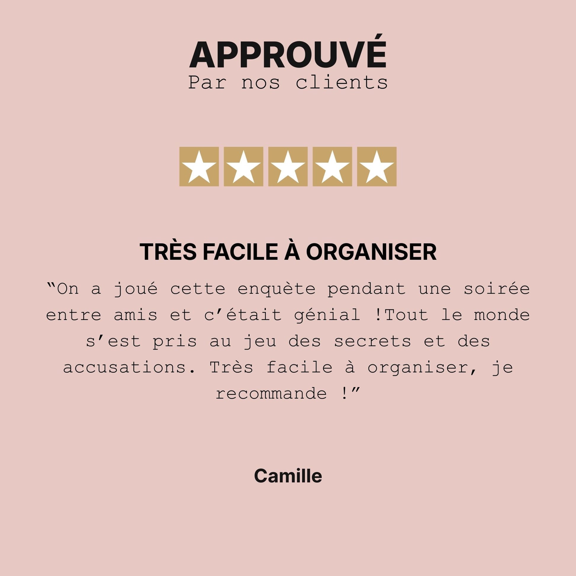 Mais chaque enquête peut être adaptée à votre groupe : que vous soyez 6 amis dans un appartement ou 12 en week-end à la campagne, le jeu s’ajuste facilement.
